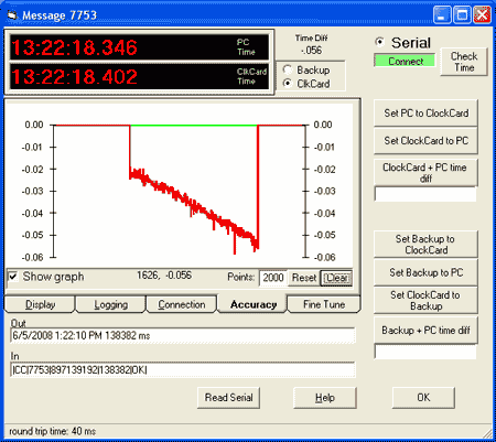 diff: shows the difference (in ms) between the computer and RTC