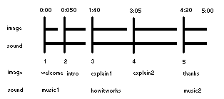 The image track consists of a sequence of images you wish to have in the show. The timing of each slide should be shown on each slide. The sound track would have a series of sound files that are the same or fewer in number than the image files. Sound files can last longer than the timing of an image file. Sound files must begin at the start of an image file. Sound files can only be interrupted by subsequent sound files. Tips: