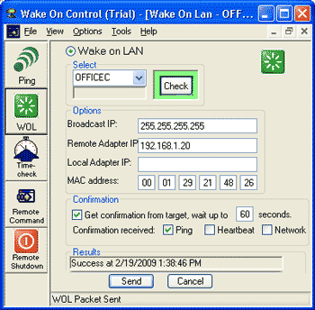 Wake on Control - allows you to control computers remotely on your network. Start them up, shut them down, check the time or issue a remote command. It's easy. In the simple command mode Wake On Control allows to to issue commands to a single computer on your network or on the Internet. Exclusive feedback controls tells you that the command has been completed.